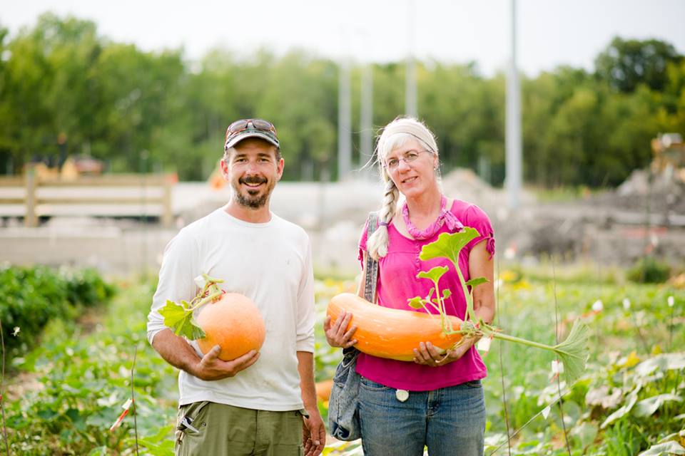 Photo ci-dessus: Kenton Lobe et Caroline Chartrand tenant les courges Arikaras et Gete Okosomin dont les graines ont été conservées à la Ferme CMU en 2013 Photo prise sur le site de la Ferme CMU.